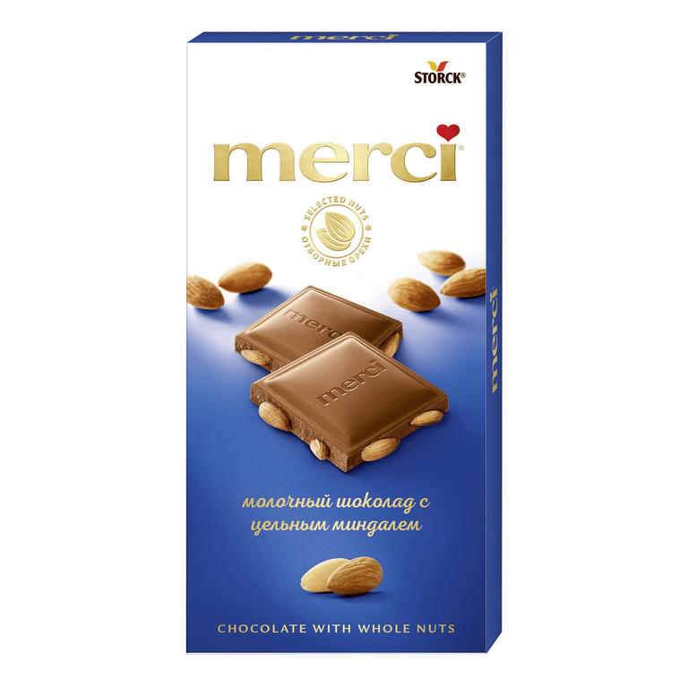 Merci - это изысканное сочетание различных сортов шоколада в индивидуальной упаковке из золотой фольги. Появившись в Германии в 1965 году, бренд Мерси сразу нашел путь к сердцам людей, став первым шоколадом, с помощью которого можно выразить особую благодарность.Merci шоколадные плитки - это шоколад высочайшего немецкого качества и потрясающего вкуса. Оригинальная упаковка в виде конверта содержит четыре изящных индивидуально упакованных плиточки шоколада. Шоколадные плитки Merci представлены в шести изысканных вкусах: молочный шоколад, молочный шоколад с лесным орехом и миндалем, шоколад горький 72%, шоколад с марципаном, шоколад с ореховым кремом, шоколад со вкусом кофе и сливки.